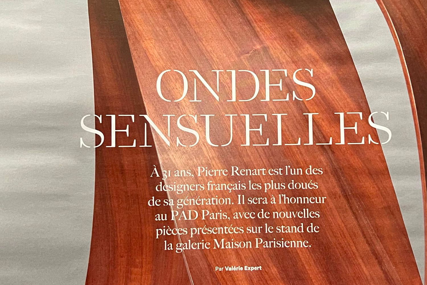 メゾンを代表するレザーがウォールナット材と出逢った『Wave』と『Ruban』は、ルナールのトレードマークである流れるような曲線が目を惹く作品です。彼は自然界に着想を得て、薄い木材を緻密に組み立てることでまるで原木から削り出したかのような曲線を生み出し、『Wave』にはマホガニー、『Ruban』にはメゾンのカラーであるヴェール ヘリテージ(濃緑)とヴェール ルミエール(萌木)のレザーを合わせました。