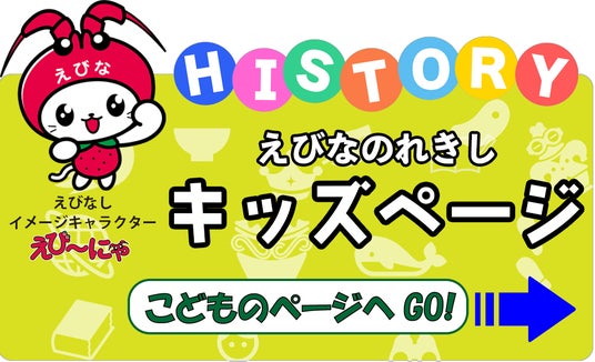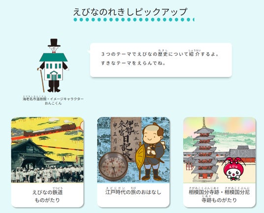 海老名市イメージキャラクター「えび~にゃ」が目印の子ども向けの資料解説・学習コンテンツ。ページ内では「えび~にゃ」や「おんこくん」(海老名市温故館のイメージキャラクター)が資料をわかりやすく解説してくれます。社会科資料集『わたしたちの海老名』の内容に関連した資料を探すこともできるので、学校の授業にも活用できます。