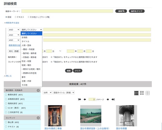 資料タイトルや作成者をはじめとするキーワード検索のほか、資料の種類や時代、エリアごとに絞ってピンポイントで気になる資料をすぐに探すことができます。