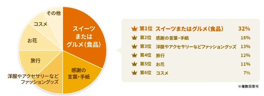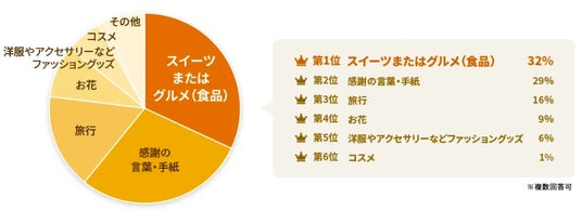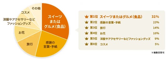 1位がスイーツまたはグルメなどの食品、2位が感謝の言葉・手紙、3位が旅行