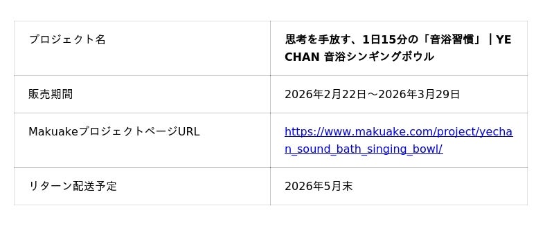 『YECHAN 音浴シンギングボウル』のMakuakeでの先行販売は、2026年3月29日までです。気になっていた方は、この機会にぜひプロジェクトページをご覧ください。
