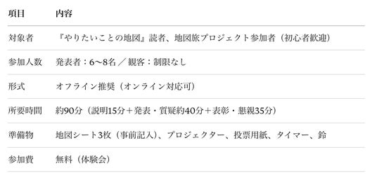 コーチング業を営む株式会社Mission Full(所在地:大阪府、代表取締役:兼若勇基)は、書籍『人生のモヤモヤから解放される!「やりたいこと」の地図』(SBクリエイティブ刊)を携えて全国100施設を巡る「地図旅プロジェクト」のプログラムとして、参加型ピッチイベント 「MAP BATTLE(マップバトル)」 の体験会を2026年5月より順次開始します。
