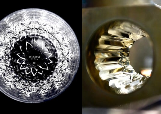 画像の説明:左から万華鏡のような輝きを放つグラスの底面と輝きの秘密を支える金型の一部