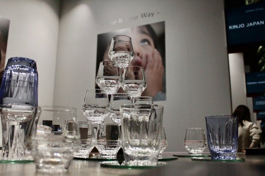 画像の説明:2024年出展ブースより小ぶりなサイズが特徴のKINJO JAPAN F0(別名:SAKEグラス)がシャンパンタワーのようにピラミッド型に積み上げられた様子。輝きはまるでガラス