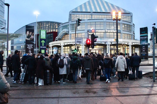 画像の説明:ドイツのフランクフルト・アム・マインにある国際展示場メッセ・フランクフルト外観と会場へ向かう出展者