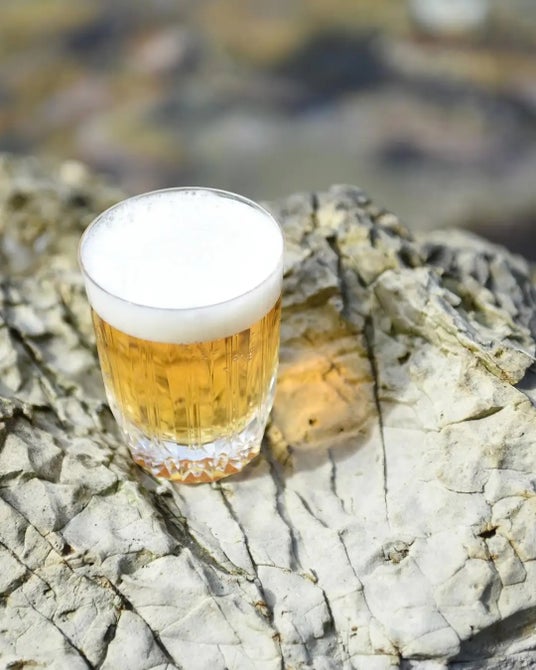 画像の説明:ビールの入ったKINJO JAPAN E1(クリア)が岩場に置かれた様子