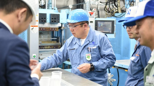 画像の説明:ゴム部品製造ラインにてKINJO JAPAN製造責任者が作業をしている様子とその周りで説明を行う開発メンバー