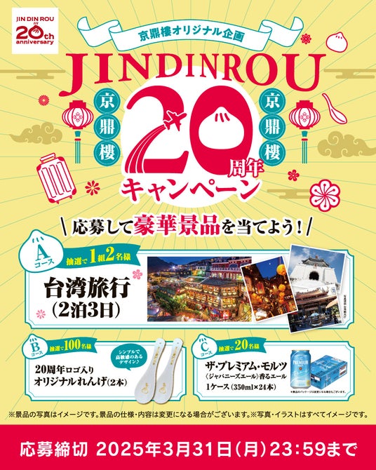 株式会社 JIN DIN ROU(本社:東京都品川区、代表取締役 荻巣雄太)は京鼎樓(ジンディンロウ)20周年を記念して特別コースの販売や台湾旅行が当たるキャンペーンなど多彩なイベントを開催します。