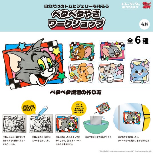トムとジェリー、タフィーを自分の好きな色に塗れる〈ペタペタ焼き〉では、限定デザインの「トムとジェリー」と「とむとじぇりーごっこ」の6種類の絵柄をご用意!