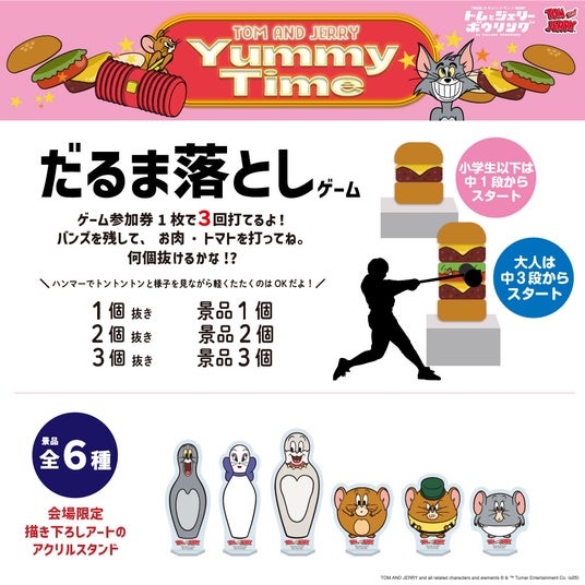 トムとジェリーが潜んでいるかも!?ハンバーガーの具材をハンマーで叩いて抜いていこう!〈だるま落としゲーム〉では、抜けた具材の数に応じて限定のボウリングのピンやボールになったキャラクターたちのアクリルスタンドをプレゼント!