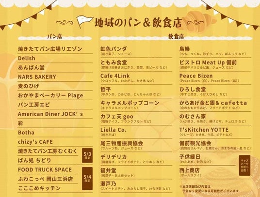 県内の各地域で愛されるパン店や飲食店が約40店舗登場する飲食ブース。備前市内外の人気ベーカリーが集結する「パン販売コーナー」では、ハード系から、春にぴったりのスイーツ系まで豊富に、取り揃えています。
