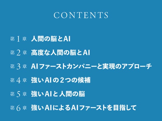 第3章では、日本ではほとんど注目されていないAIファーストと呼ばれる欧米企業の壮大なビジョンとビジネス戦略を紹介し、その実現に必要なAI技術を考察。第4章は、AIファーストを実現するであろう2つの強いAIを紹介するとともに解説します。