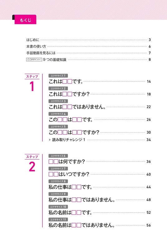 理屈や文法は後回し! 手話表現の基本となる、ごくシンプルな構文だけをピックアップしているので、まずは動画を見ながら、見よう見まねで繰り返し練習できます。言葉を身につけるには、とにかく繰り返すこと。各章末掲載の、手話動画の意味を読み取る「読み取りチャレンジ」コーナーでは、構文や単語がきちんと定着しているか確認できます。あせらず、あわてず、あきらめず! 繰り返せば繰り返すほど、手話はうまくなります。本書と動画を活用して、手話の基本表現をマスターしましょう!