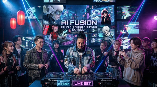 AI FUSION FESはAIイラスト× AI動画 × AI音楽を軸に、展示・映像・音楽体験・交流を組み合わせた参加型イベント。更にAI音楽を活用したDJ/VJ演出、ミニトーク、グッズ販売も予定。