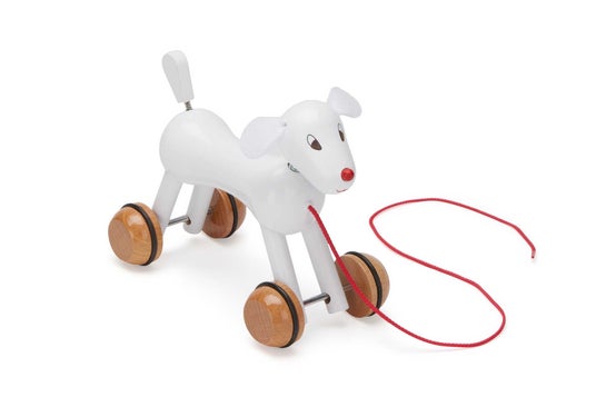 奈良美智の犬の彫刻をモチーフにしたこの小さなプルトイは、フランスの伝統的な玩具メーカー、Vilac(ヴィラック)社によって製作されました。(デザインは奈良美智の彫刻をベースに、ヴィラック社とのコラボレーションでリデザインされたものです。)本体はブナの無垢材に特殊な処理でラッカー塗装が施され、木とゴムの車輪が4つ付いています。奈良美智ファンにとってもコレクターズアイテムとして最適です。奈良美智の作品は、MoMAのコレクションに収蔵されています。