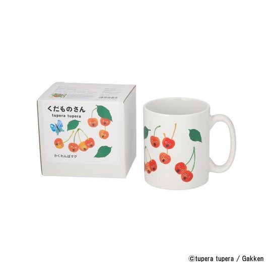 “くだものさん”がかくれんぼをしているような姿があしらわれたマグカップ。