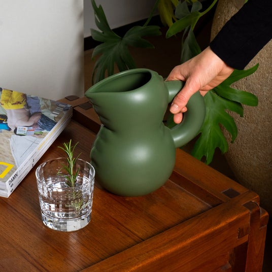 空気を入れて膨らませるプラスチックトイを模した、巧みなトロンプ・ルイユ(だまし絵)オブジェのカラフェ。セラミックを使い、ポルトガルで手作業で作られています。ベルギーを拠点とするHome Studyoによる「Blow Up Collection」のアイテムのひとつで、このコレクションではプラスチックではなくセラミックを使い、遊び心あふれる子供時代の記憶や夏の楽しい思い出を彷彿させるアイテムを展開しています。お気に入りの飲み物を入れたり、植物に水をやったり、花を生けて飾ったりと多機能なカラフェです。