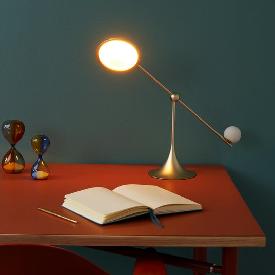 エレガントなシーソーを思わせるポータブルランプ。デスクランプとしての機能と遊び心のあるオブジェの役割を兼ね備えています。アルマイト加工を施した高品質のアルミニウムとガラスを使用した、動くオブジェにもなる調節可能なデスクランプです。片側に緩やかにカーブした形状のライト、反対側に小さな球状のライトが付いています。軸をそっと押すと、360度回転します。