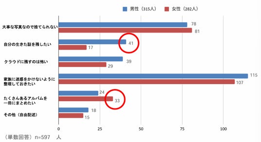 33人(11.7%)が「たくさんあるアルバムを一冊にまとめたい」と女性が回答した一方で、男性は24人(7.6%)という結果から、女性は遺品整理として写真の残し方へのこだわりがあることが推測されます。