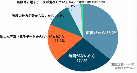 また、「整理の仕方が分からない」が11.4%「紙媒体と電子データが混在しているから」が6.1%、と、アナログとデジタルの併存による混乱も一定数存在することが判明しました。