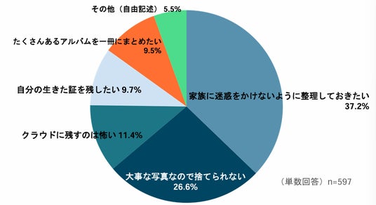 次いで「大事な写真なので捨てられない」が26.6%、「自分の生きた証を残したい」が9.7%と、写真を遺したいという意見も少なからず見受けられ、写真整理に関するジレンマを感じます。