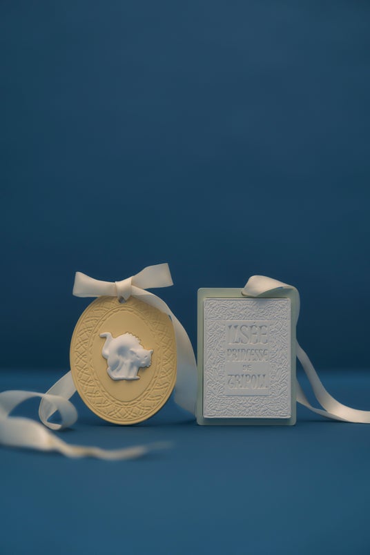 オードトワレなどを吹きかけて吊るせば柔らかな薫香が空間に広がる、優しい色合いのアロマストーン。『トリポリの姫君イルゼ』の挿絵に描かれた猫をモチーフにカメオ風にアレンジしたYEL(イエロー)と、表紙が本のようにデザインされたMNT(ミント)の2色展開。A.M.MUCHAのロゴがゴールドで施されたリボンを結んでご使用いただけます。