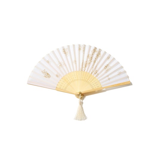 昨年も好評いただいたアイテムの一つである扇子が『四つの花:リリー』のデザインで新登場。リリーの線画をゴールドのラメで描いた美しい扇子は、ジャポニズムに影響を受けたミュシャならではのアイテムです。使用しやすいサイズ感とシーンを問わないデザインでギフトにもおすすめです。