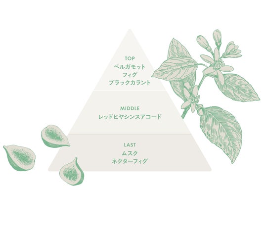 ヒヤシンス姫のイメージから果実の甘さを出しつつも、どことなく大人の色気や魅力を感じられるような香りに仕上げました。熟した果実のトロッと、たっぷりとした果肉感に、果実に実るリーフ感が思わず病みつきになってしまうような香りかと思います。ヒヤシンス姫の意図とせず人を引き寄せてしまう、ちょっぴり小悪魔的な要素を香りで表現しつつ、エレガントなフルティーノートを楽しんでいただければと思います。