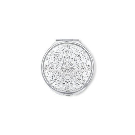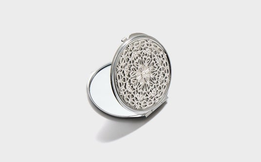 作品の象徴的なオーナメントをモチーフに、繊細なレリーフを施した折りたたみ式ミラーは拡大鏡付き。エレガントな印象で、お出かけ先でのお化粧直しの時間も優雅に演出してくれます。手のひらサイズのコンパクトなサイズ感は収納や持ち運びにも便利です。