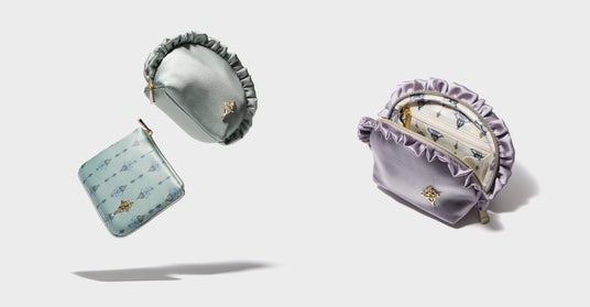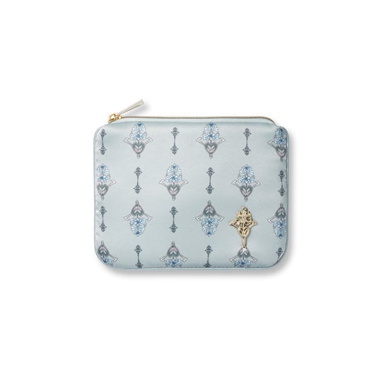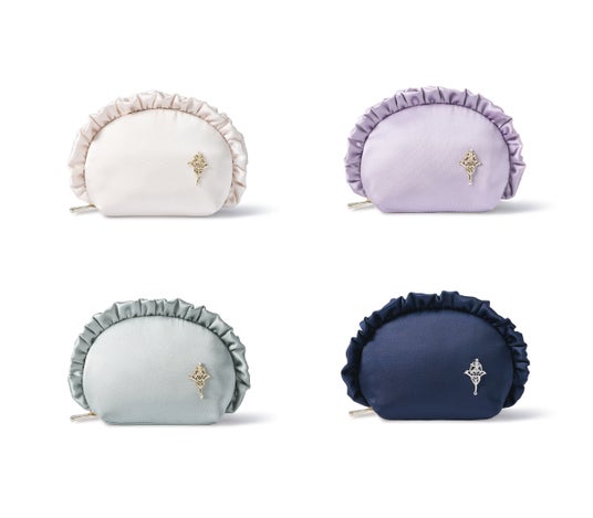 上品な光沢のサテンフリルがフェミニンな印象を与えるコンパクトポーチ。内側にはエレガントなオーナメントモチーフのプリントが施され、細部までこだわったデザイン。13mLのオードトワレも入る使いやすいサイズ感で、デイリー使いはもちろん、ギフトにもおすすめです。