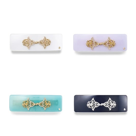アセチ素材の美しい発色と光沢感が華やかな印象のMサイズのバレッタは、ハーフアップやサイドにまとめた髪のアクセントにもおすすめです。