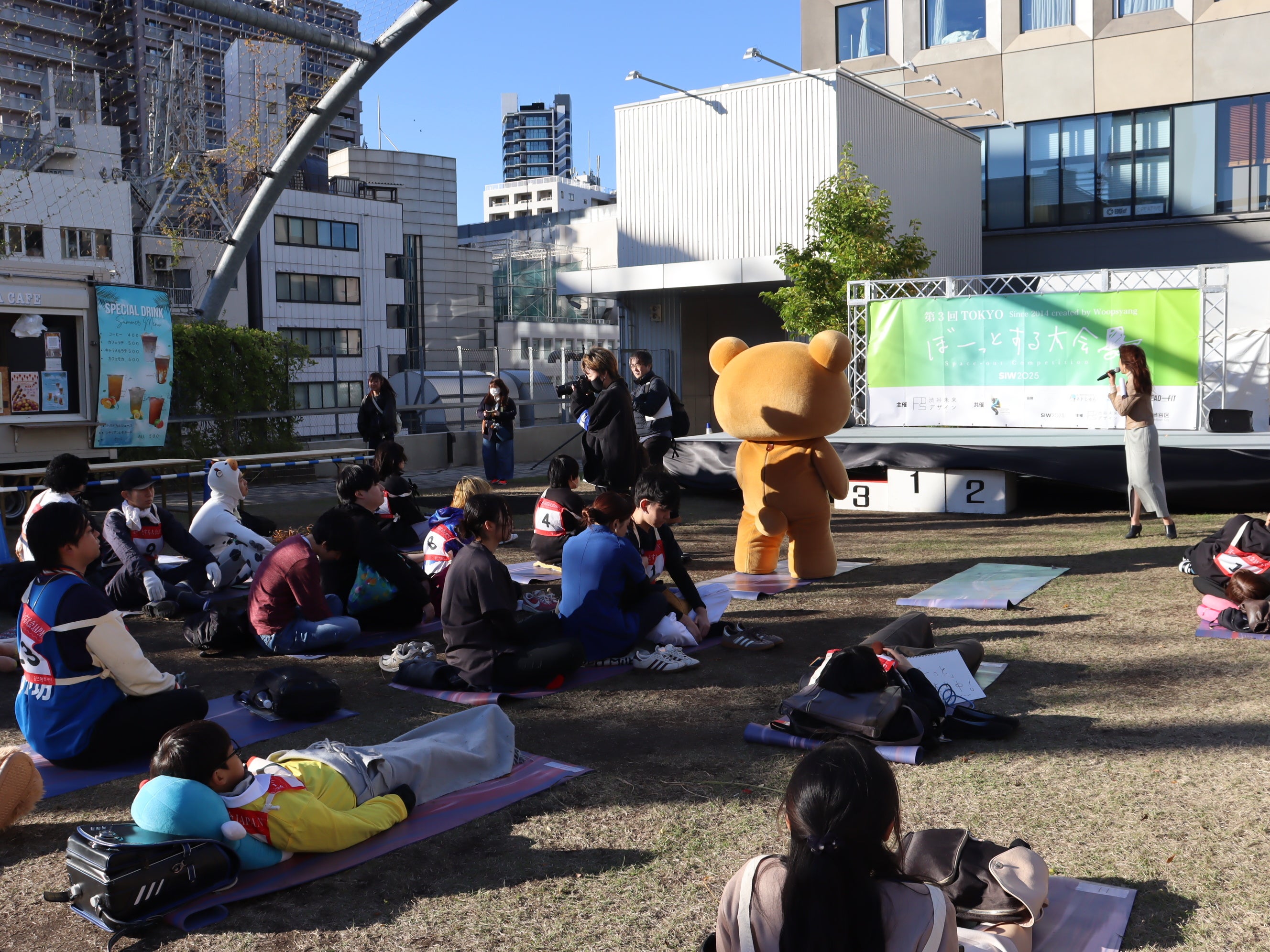 リラックマは、今年夏に大阪・関西万博にて開催された90分間ただ“ぼーっと”過ごすだけで心身を整える国際ウェルネス競技『ぼーっとする大会』大阪大会に続き、今回の『第3回TOKYOぼーっとする大会』にも参加し、大会参加者とともに“ぼーっとする時間”を過ごしました。