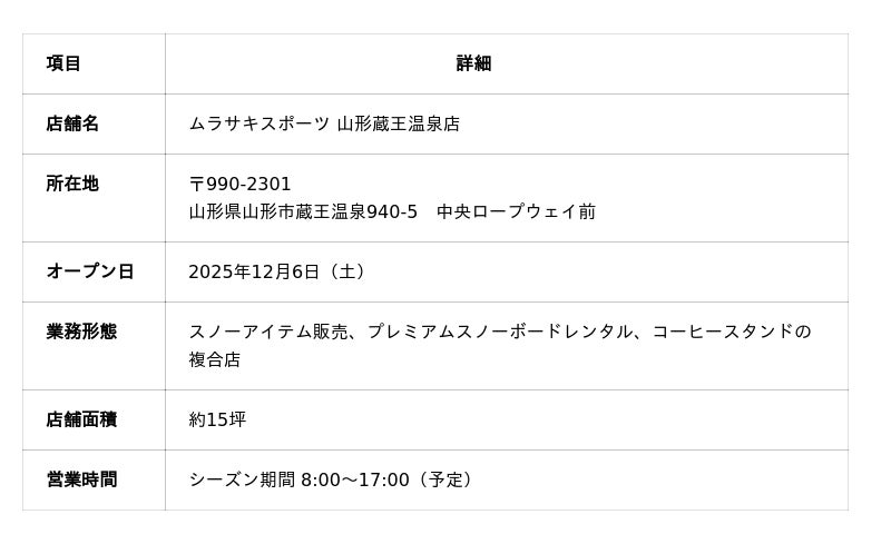 株式会社ムラサキスポーツ(本社:東京都台東区、取締役社長:金山洋一)は、2025年12月6日(土)に、雪質の良さと雄大な樹氷、そして伝統的な温泉で知られる国内有数のスノーリゾート「山形蔵王温泉スキー場」に、新たなコンセプトショップ「ムラサキスポーツ 山形蔵王温泉店」をオープンいたします。