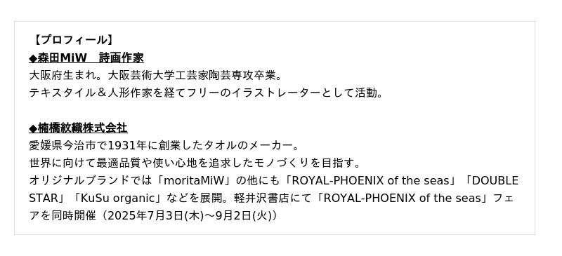 「morita MiW」は、癒したり、励ましたり、優しく見守ったり、不思議を投げかけたり、登場する人物や動物、植物が何かを語りかけてくるような世界を描く詩画作家・森田MiWと、創業以来90年以上にわたり細部にこだわるモノづくりを続ける愛媛県今治市のタオルメーカー「楠橋紋織」が『手にする人をハッピーに』をコンセプトに、暮らしの中のアクセントになるモノやコトを共同で生み出すコラボレーションブランドです。