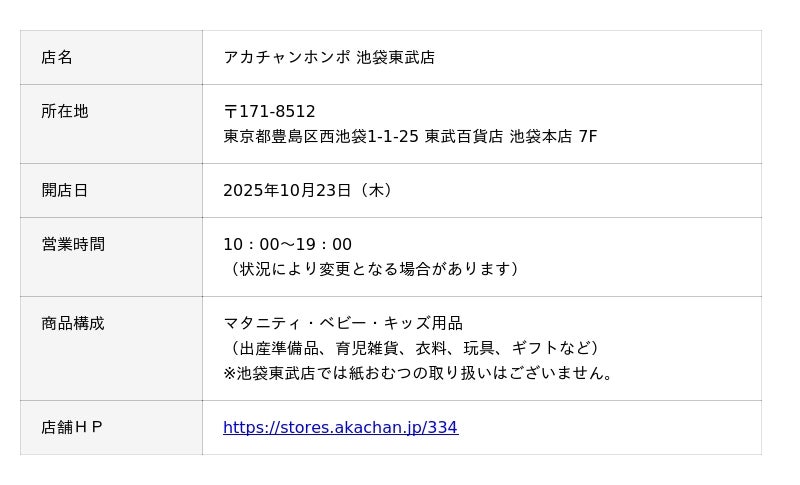 株式会社赤ちゃん本舗(本社:大阪市中央区 https://www.akachan.jp)は、東京都豊島区にある「東武百貨店 池袋本店」内に、『アカチャンホンポ 池袋東武店』を2025年10月23日(木)オープンいたしました。