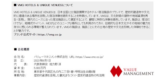 バリューマネジメント株式会社(本社:東京都千代田区、代表:他力野 淳、以下当社)が展開するグループブランド「VMG HOTELS & UNIQUE VENUES」は、千葉県香取市で運営する分散型ホテル佐原商家町ホテル NIPPONIAにおいて、地域居住者や佐原にゆかりのある方々に向け、醸造・日本酒をテーマにした新たな和の結婚式プラン「祝杯婚」を2025年5月より提供開始いたします。