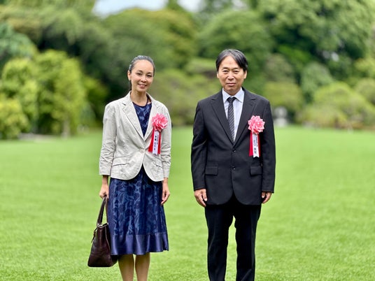 文章担当の東郷なりさ氏(左)と、写真担当の江口欣照氏(右)。第72回産経児童出版文化賞授賞式が行われた東京元赤坂の明治記念館、日本庭園にて