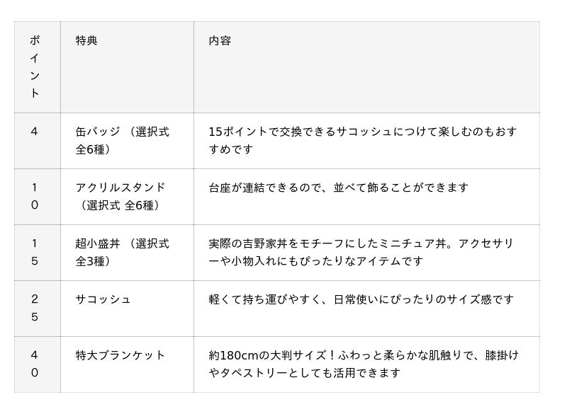 ポイントに応じて特典と交換が可能です。特典を交換するとポイントは減算され、再度ポイントを貯めることで何度でも特典と交換することができます。