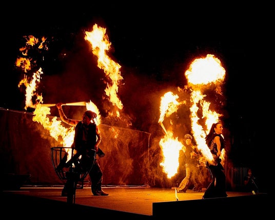 花火の音が峡谷に響き、炎のパフォーマンスが夜空を照らす――