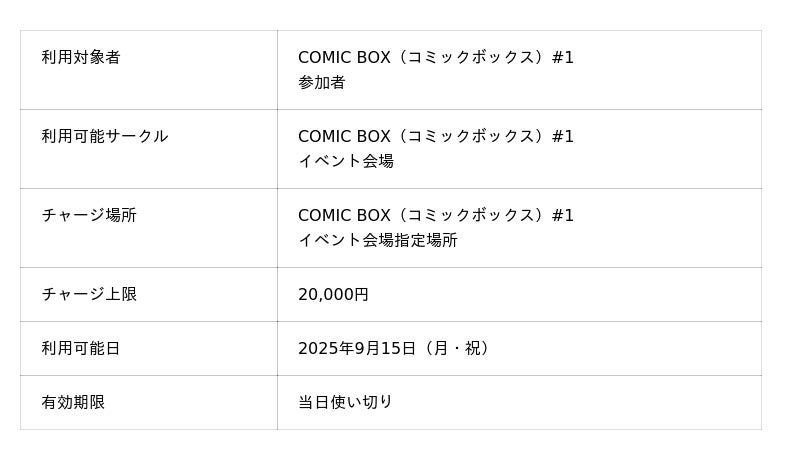 株式会社ポケットチェンジ(本社:東京都港区、代表取締役:青山新:以下ポケットチェンジ)は、同人サークル N-Point(代表:中込椋)が主催する同人誌即売会 COMIC BOX(コミックボックス)#1 会場内で使用できる「コミPay (ComiPay)」を2025年9月15日(月・敬老の日)限定で提供いたします。