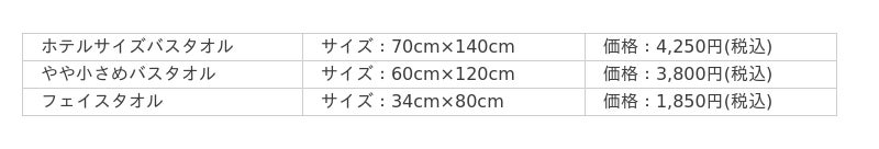 サイズおよびバリエーションはホテルサイズバスタオル、やや小さめバスタオル、フェイスタオルの