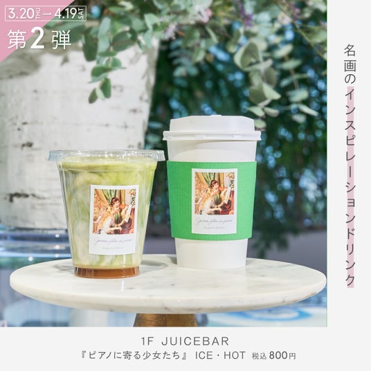 ルノワール「ピアノに寄る少女たち」のインスピレーションドリンクは、ピスタチオミルクにオーガニックの抹茶ショットを加えたラテに仕上げました。キャラメルソースの程よい甘さがアクセントとなり、ピスタチオと抹茶の香ばしく柔らかな香りをお楽しみいただけます。まろやかな口あたりの ICE、ほっこり落ち着く HOT からお選びいただけます。