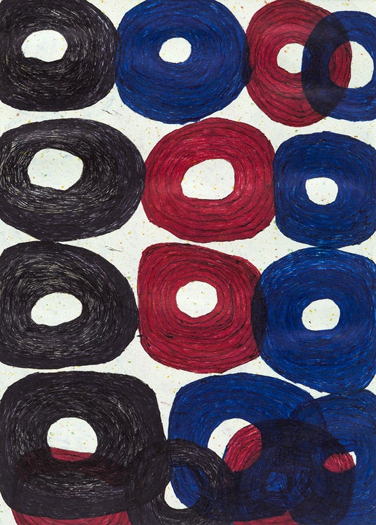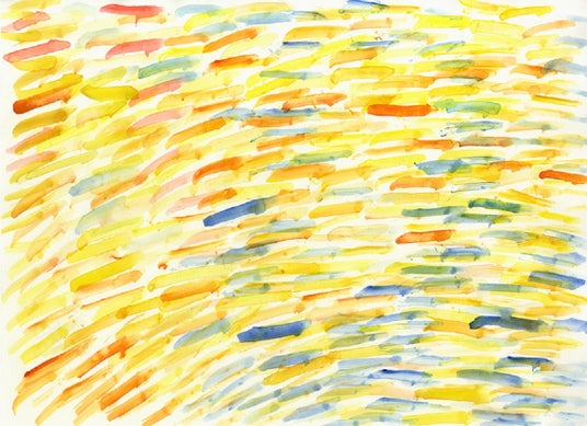 10歳のサマーキャンプで水彩画と出会って以来、自宅で「1日1枚」絵を描くのが彼の日課 。具体的なモデルはなく、その日の心の中にあるイメージに応じてパレットから数色の組み合わせを選び、ジェリービーンズや雨粒を彷彿とさせる水々しいタッチで大判画用紙を埋め尽くしていく。 色相が濁らないよう、米国製の透明水彩絵の具を愛