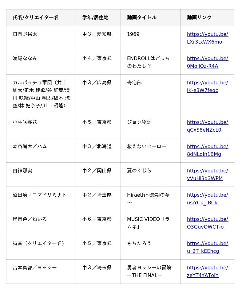 カンタ 様今日見た10作品は、僕にとってすごく刺激になりました。皆さんにはまだまだ未来があり、5年後10年後できることがどんどん広がっていった時に、皆さんが一体どんなものを作るのか、そしてその動画で人をポジティブにしたり、色々な感情にしていくのがすごく楽しみになりました。間違いなくここに来ている時点で皆さんには才能があるので、しっかり自信を持って、何一つ間違ってないと思いながら、これからも懸命に走り続けてください。