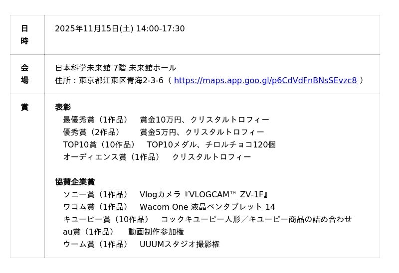 子ども向け動画制作スクールを運営するFULMA株式会社(本社:東京都渋谷区、代表取締役:齊藤 涼太郎)主催の、「全国小中学生動画コンテスト FULMA Creator Awards(フルマ クリエイター アワード)2025 」(URL: https://fulma-creator-awards.com/ )最終審査会が2025年11月15日(土)に開催され、各受賞者が決定いたしました。