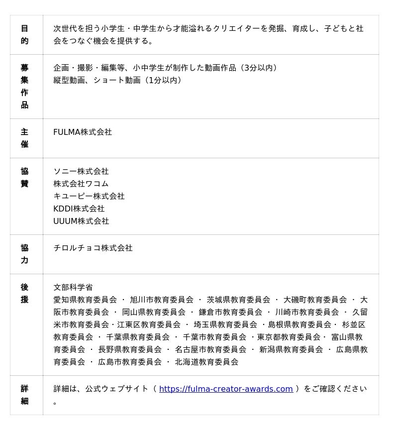 全国小中学生動画コンテスト FULMA Creator Awards(フルマクリエイターアワード)は、次世代を担う小学生・中学生から才能溢れるクリエイターを発掘、育成し、子どもと社会をつなぐ、小中学生向け動画制作コンテストです。