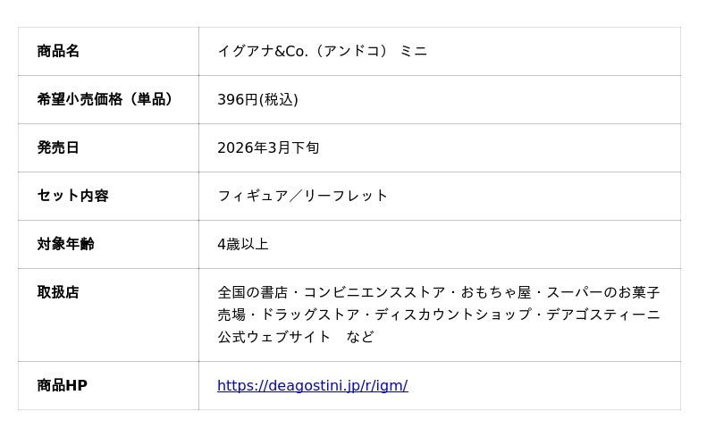 株式会社デアゴスティーニ・ジャパンは、生き物について学べるパックトイ「&Co.(アンドコ)」シリーズから、最新作『イグアナ&Co.(アンドコ) ミニ』を2026年3月下旬より全国の書店、コンビニエンスストア、おもちゃ屋、スーパーのお菓子売場、ドラッグストア、ディスカウントショップ、デアゴスティーニ公式サイトで発売します(デアゴスティーニ公式サイトでは販売予約受付中)。