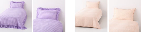 軽やかな薄手の生地にフリルをあしらった寝具カバーです。トレンドのパープルの生地に織り込まれたチェック柄が、さりげなく遊び心を感じさせるデザインです。