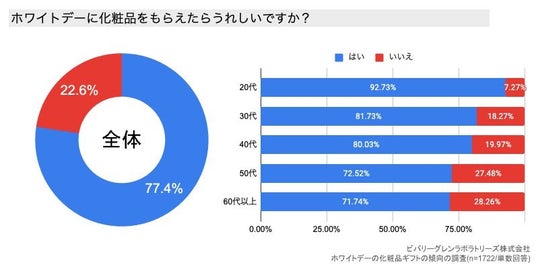 「ホワイトデーに化粧品をもらえたら嬉しい」と答えた人は、全体の約80%に。年代別のデータを見