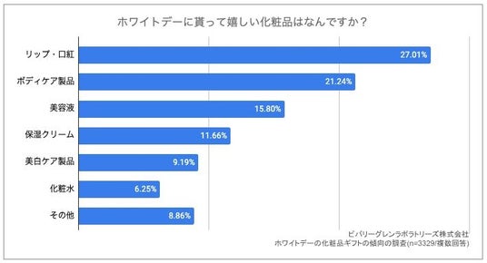 - ホワイトデーに貰って嬉しい化粧品は全体ではリップ・口紅が27.0%でトップ